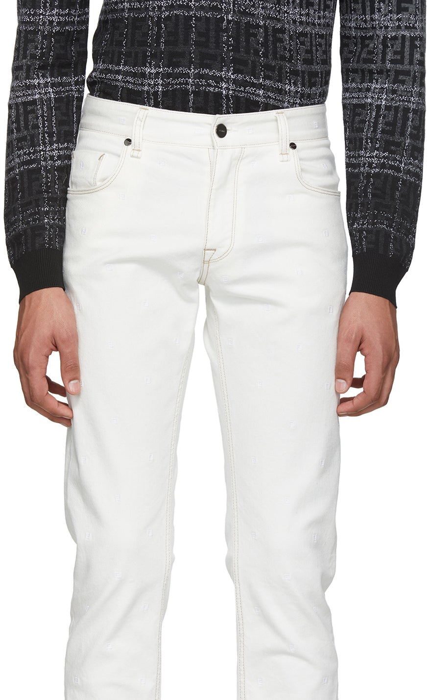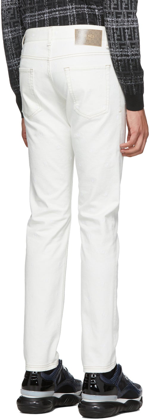 Slim-fit stretch denim jeans in white. Mid-rise. Tonal logo pattern embroidered throughout. Five-pocket styling. Belt loops at waistband. Holographic logo patch featuring logo pattern in brown and beige at back waistband. Zip-fly. Logo-engraved gunmetal-tone hardware. Contrast stitching in tan. Supplier color: White 98% cotton, 2% elastane. Brand: Fendi