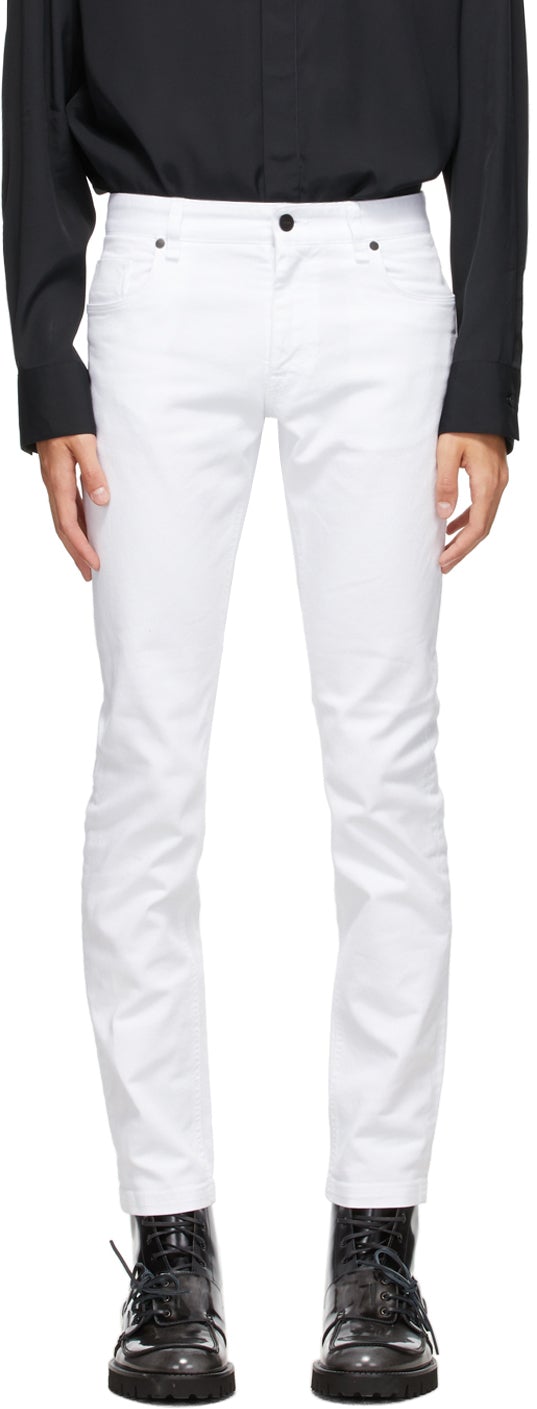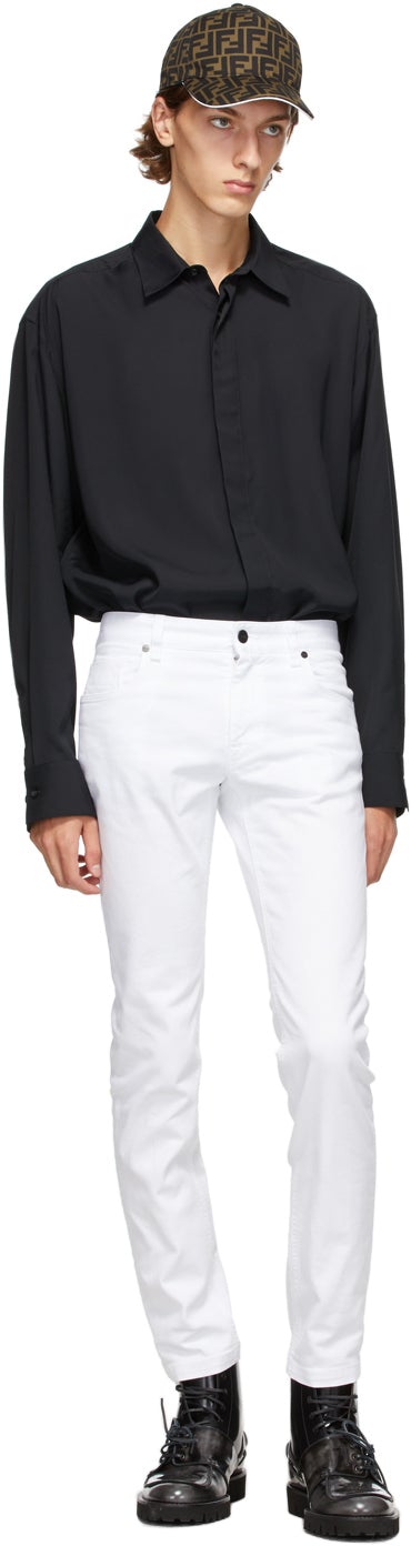 Skinny-fit stretch denim jeans in white. Mid-rise. Five-pocket styling. Belt loops at waistband. Leather logo patch in white at back waistband. Rubberized logo appliqué in black and logo flag at back pocket. Zip-fly. Black hardware. Part of the Fendi x Joshua Vides collaboration. Supplier color: White 98% cotton, 2% elastane. Brand: Fendi
