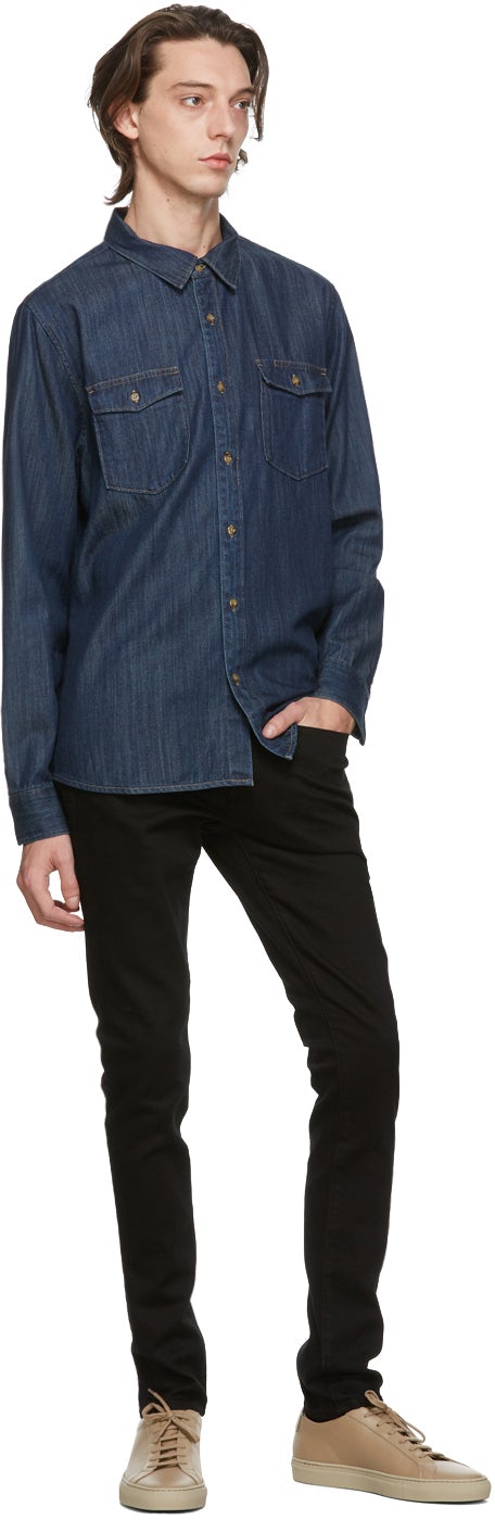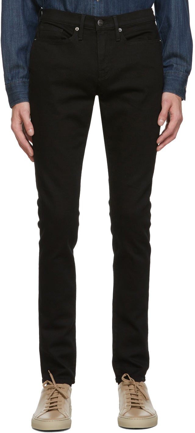 Skinny-fit stretch cotton-blend denim jeans in black. Mid-rise. Five-pocket styling. Belt loops at waistband. Zip-fly. Logo embossed silver-tone hardware. Supplier color: Black 94% cotton, 5% polyester, 1% elastane. Brand: Frame