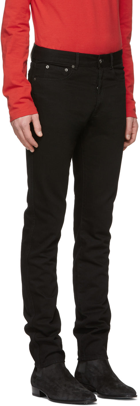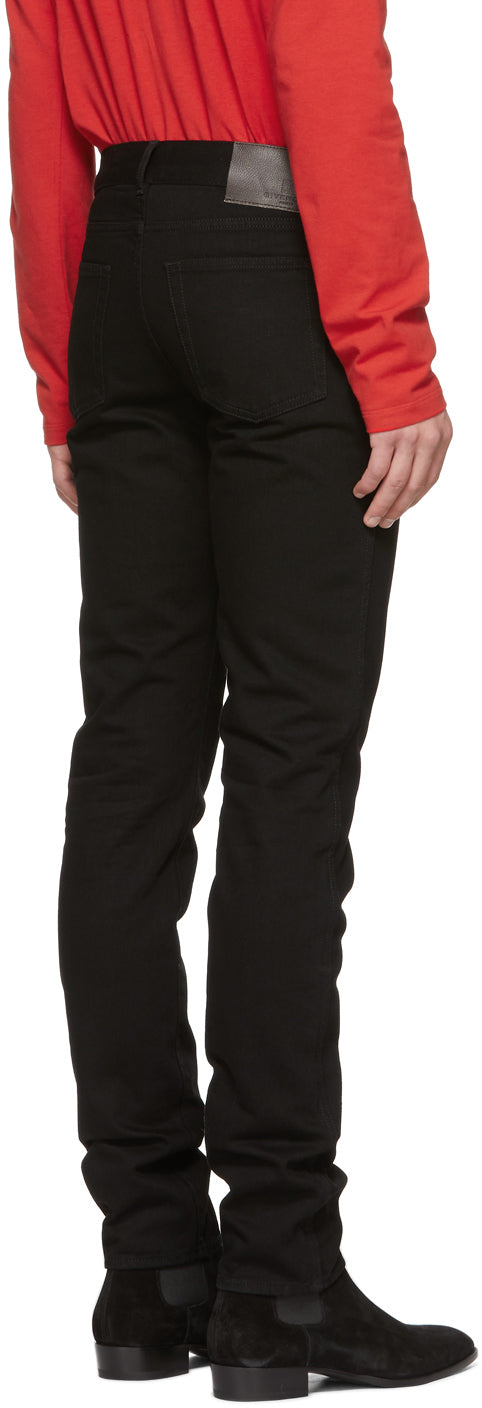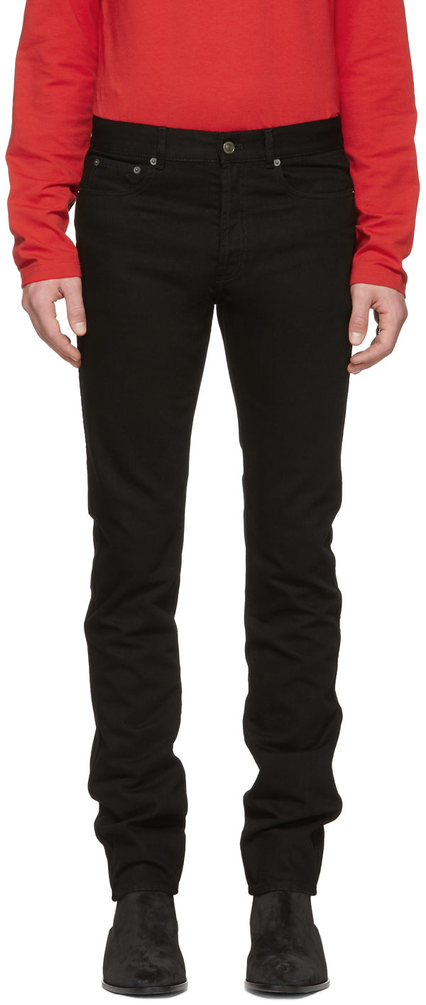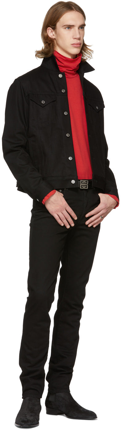 Slim-fit denim jeans in black. Mid-rise. Five-pocket styling. Leather logo patch at back hem. Button-fly. Gunmetal-tone hardware. Tonal stitching. Body: 100% cotton. Lining: 65% polyester, 35% cotton. Brand: Givenchy