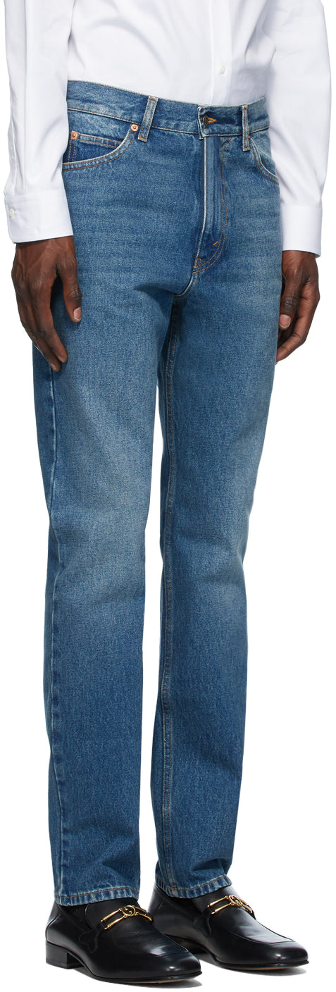 Straight-leg non-stretch denim jeans in blue. Mid-rise. Fading and whiskering throughout. Five-pocket styling. Belt loops at waistband. Logo patch at back waistband. Zip-fly. Antiqued gold-tone hardware. Contrast stitching in orange. Supplier color: Blue Wash 100% cotton. Brand: Gucci