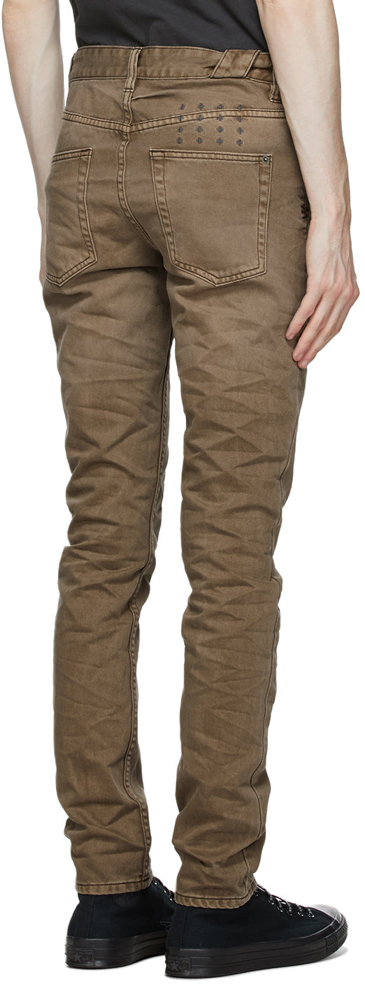 Straight-leg non-stretch denim jeans in brown. Mid-rise. Fading and distressing throughout. Five-pocket styling. Belt loops at waistband. Logo embroidered in grey at back waistband. Textile logo flag in black and white at back pocket. Logo printed in brown at back leg. Button-fly. Logo-engraved antiqued silver-tone hardware. Supplier color: Dark earth 100% cotton. Brand: Ksubi