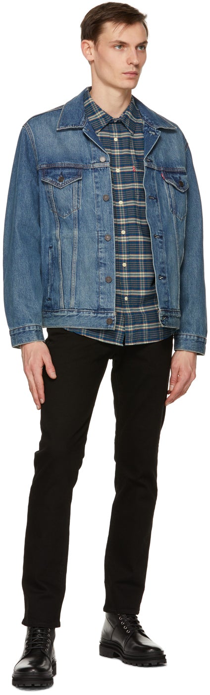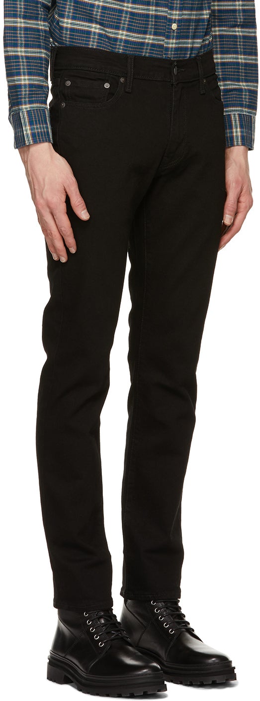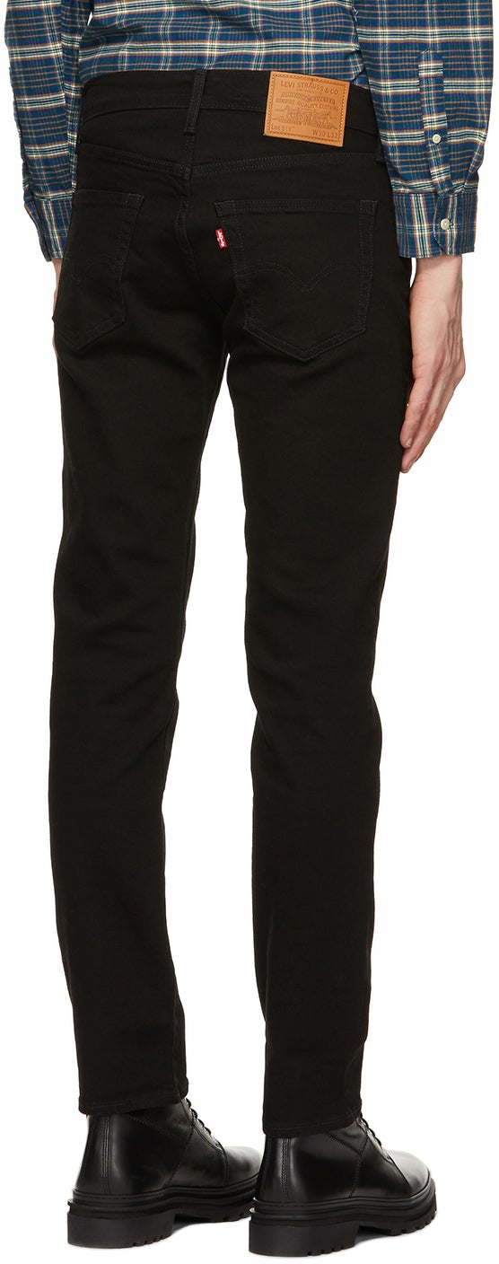 Slim-fit stretch cotton-blend denim jeans in black. Mid-rise. Five-pocket styling. Belt loops at waistband. Leather logo patch in tan at back waistband. Textile logo flag in red at back pocket. Zip-fly. Logo-engraved antiqued silver-tone and bronze-tone hardware. Supplier color: Black knight 68% cotton, 31% lyocell, 1% elastane. Brand: Levi's