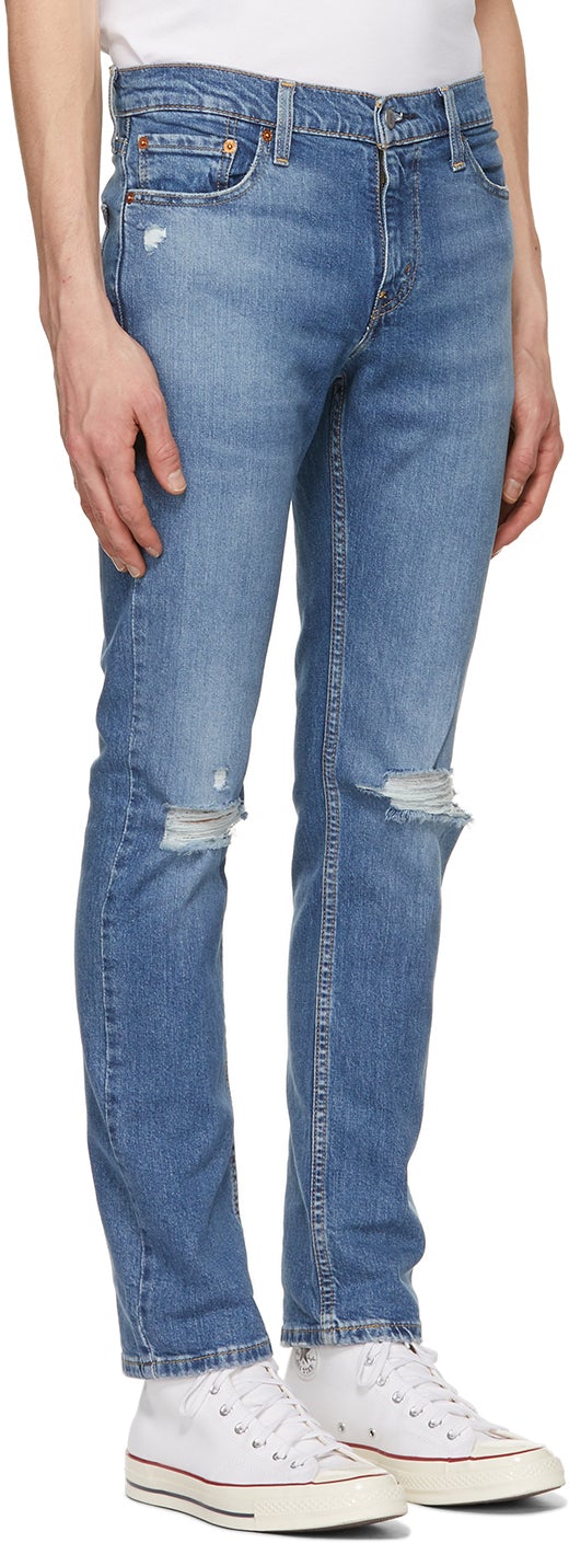 Slim-fit stretch cotton-blend denim jeans in blue. Mid-rise. Fading and distressing throughout. Five-pocket styling. Belt loops at waistband. Rips at knees. Jacron logo patch in tan at back waistband. Textile logo flag in red at back pocket. Zip-fly. Logo-engraved silver-tone and bronze-tone hardware. Contrast stitching in tan. Supplier color: Dolf nugget 70% cotton, 28% lyocell, 2% elastane. Brand: Levi's