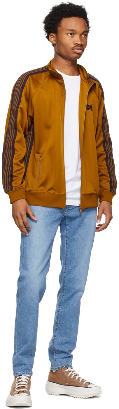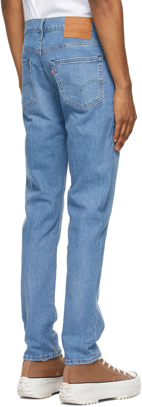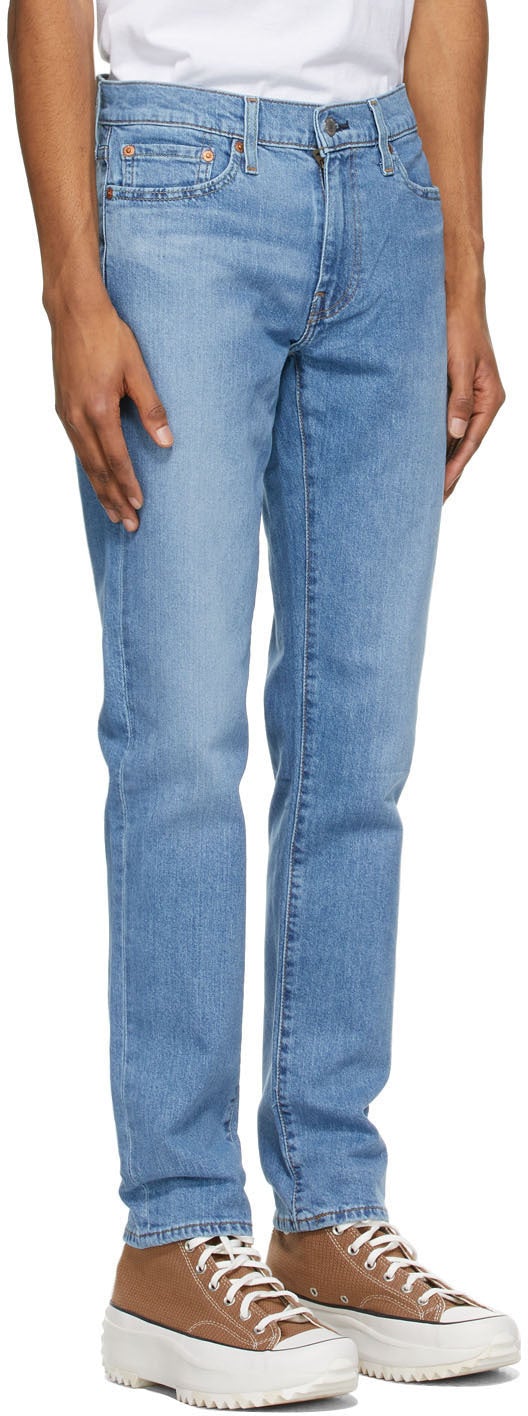 Slim-fit stretch denim jeans in blue. Low-rise. Fading and whiskering throughout. Five-pocket styling. Belt loops at waistband. Leather logo patch in tan at back waistband. Textile logo flag in red at back pocket. Zip-fly. Silver-tone and copper-tone hardware. Contrast stitching in yellow and tan. Supplier color: Corfu got friends 68% cotton, 31% lyocell, 1% elastane. Brand: Levi's
