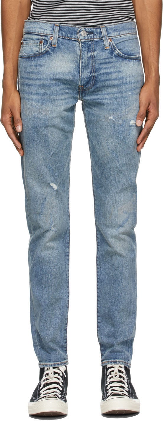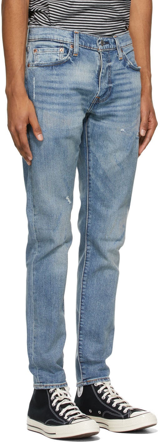 Tapered stretch denim jeans in blue. Mid-rise. Fading, whiskering, and distressing throughout. Five-pocket styling. Belt loops at waistband. Leather logo patch in tan at back waistband. Textile logo flag in red at back pocket. Zip-fly. Silver-tone and copper-tone hardware. Contrast stitching in yellow and tan. Supplier color: The nobodies 68% cotton, 31% lyocell, 1% elastane. Brand: Levi's