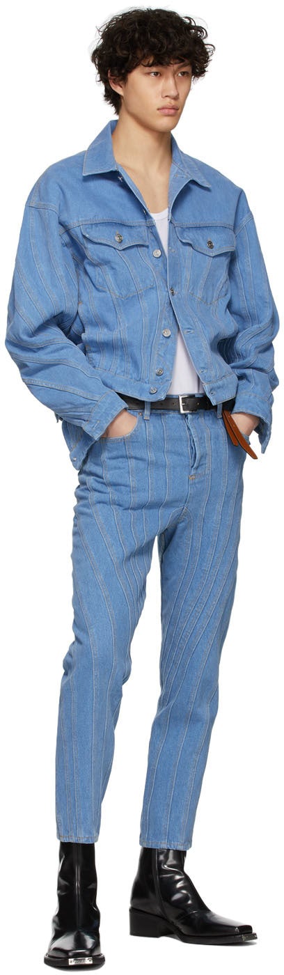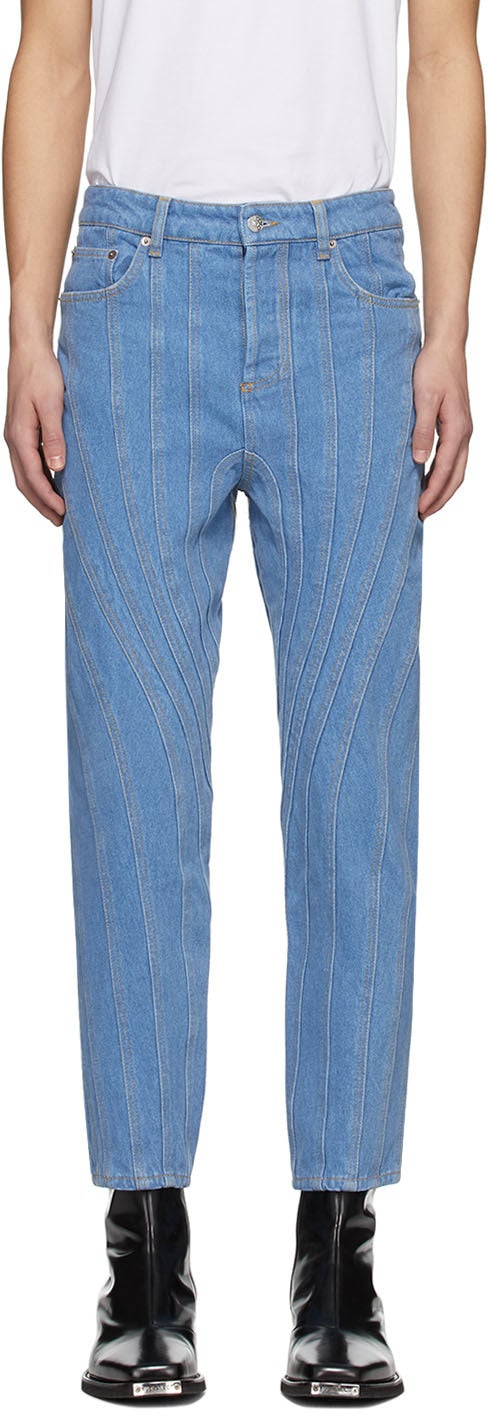 Straight-leg panelled non-stretch denim jeans in blue. High-rise. Five-pocket styling. Belt loops and transparent PVC logo patch at waistband. Button-fly. Partially lined. Logo-engraved silver-tone hardware. Contrast stitching in yellow. Available exclusively at SSENSE. Supplier color: Blue Body: 100% cotton. Lining: 80% polyester, 20% cotton. Brand: Mugler