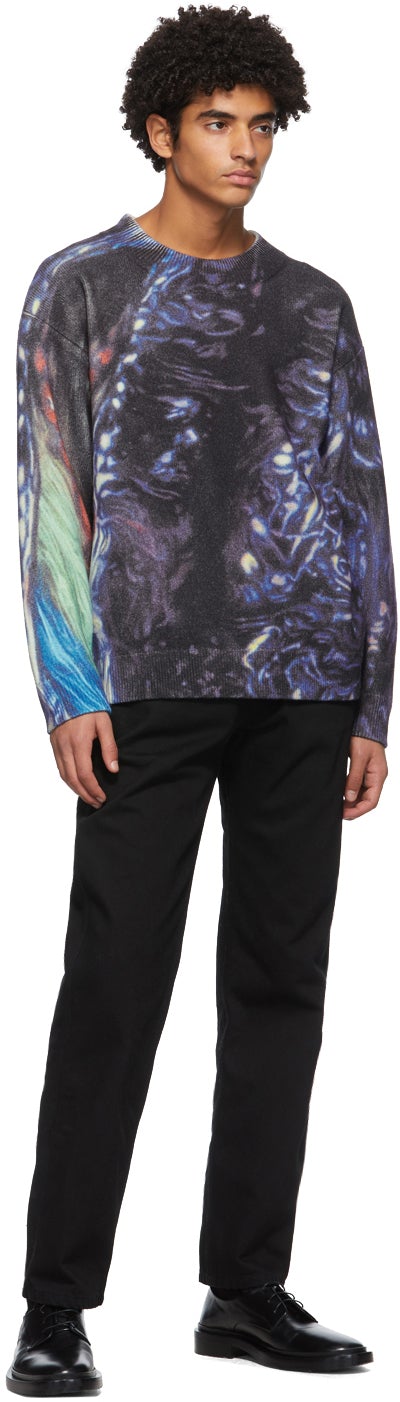 Tapered non-stretch overdyed Italian denim jeans in black. Mid-rise. Five-pocket styling. Belt loops at waistband. Textile logo patch at back waistband. Zip-fly. Logo-engraved silver-tone hardware. Supplier color: Black 100% cotton. Brand: Namacheko