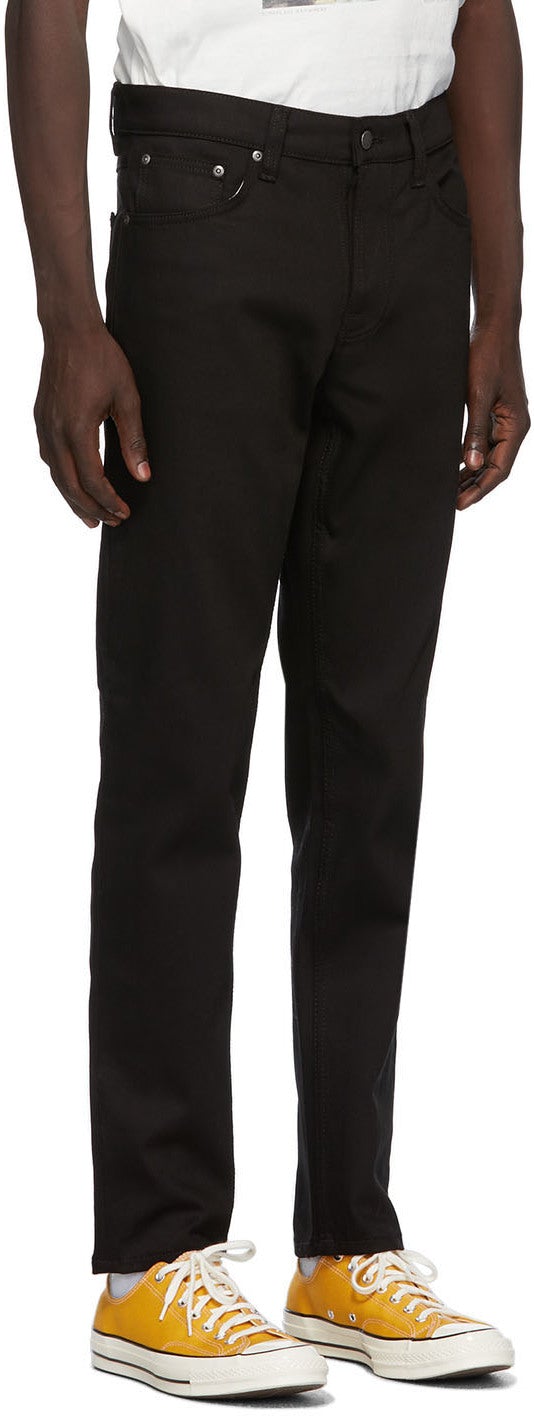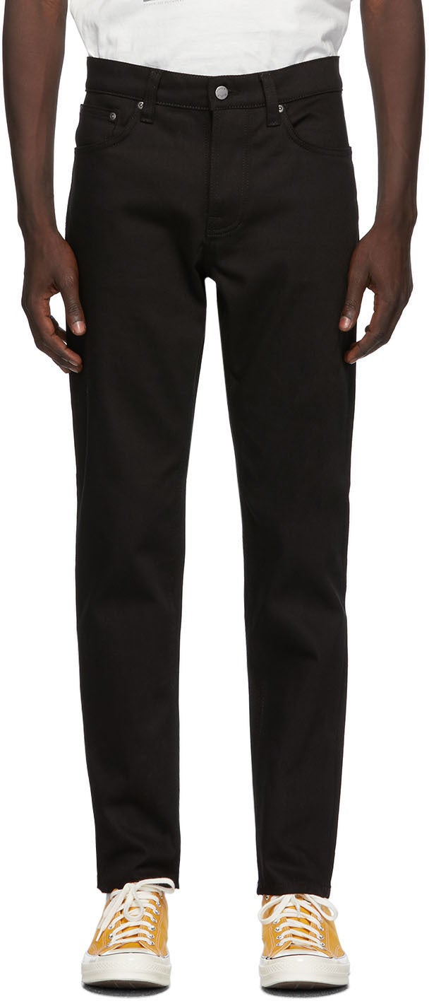 Slim-fit stretch organic cotton denim jeans in black. Mid-rise. Five-pocket styling. Belt loops at waistband. Tonal Jacron paper logo patch at back waistband. Textile logo patch and signature topstitching at back pockets. Zip-fly. Logo-engraved antiqued copper-tone hardware. Supplier color: Dry black 99% organic cotton, 1% elastane. Brand: Nudie Jeans