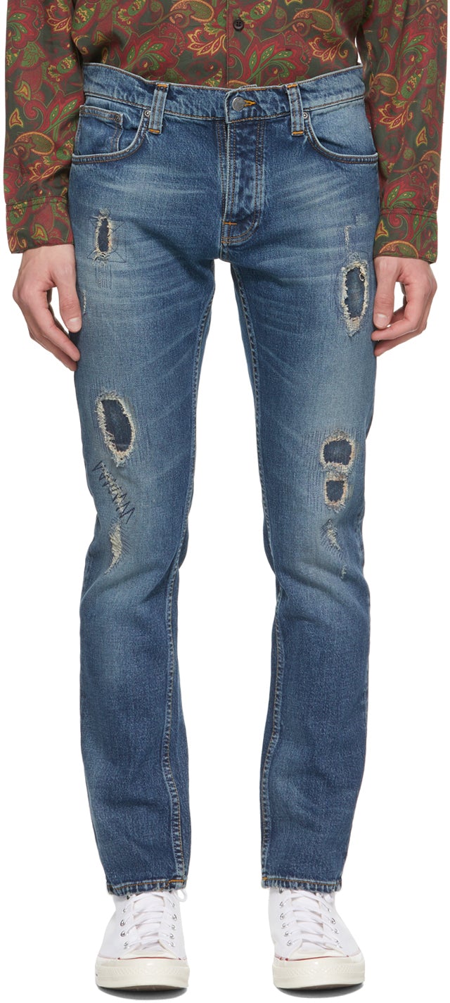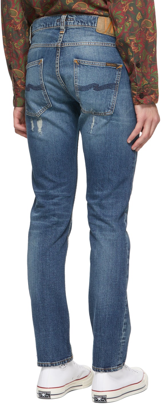 Slim-fit stretch 12.5 oz. organic cotton denim jeans in blue. Mid-rise. Fading, whiskering, and distressing throughout. Five-pocket styling. Belt loops and jacron logo patch at waistband. Signature tonal topstitching and textile logo patch at back pockets. Zip-fly. Logo-engraved gunmetal-tone hardware. Contrast stitching in orange. Supplier color: Dusky bay 99% cotton, 1% elastane. Brand: Nudie Jeans