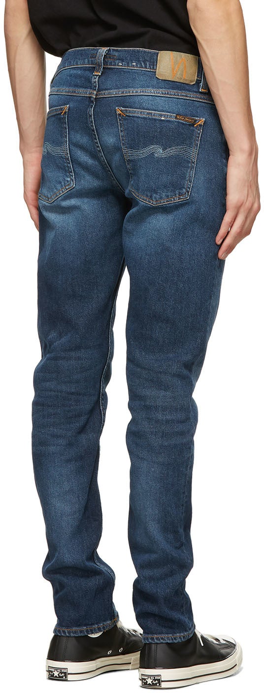 Slim-fit stretch 14.75 oz organic cotton denim jeans in blue. Mid-rise. Fading and whiskering throughout. Five-pocket styling. Belt loops and Jacron paper logo patch in tan and orange at waistband. Signature tonal topstitching and textile logo patch in black at back pockets. Zip-fly. Logo-engraved copper-tone hardware. Contrast stitching in orange. Supplier color: Dark sharp twill 99% cotton, 1% elastane. Brand: Nudie Jeans
