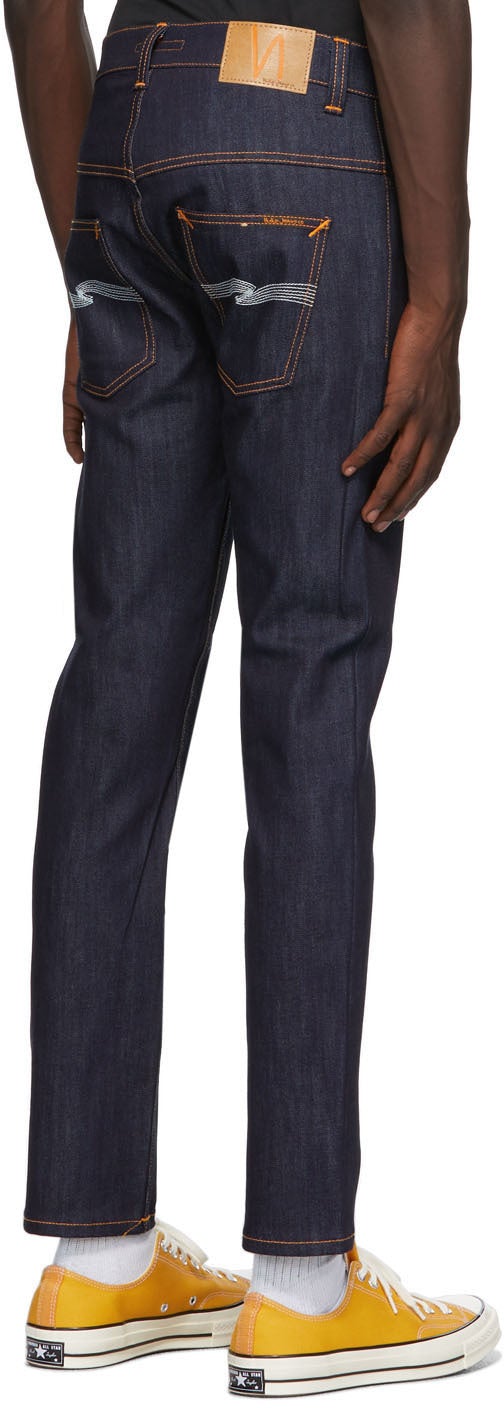Slim-fit stretch 10.75 oz. dry organic cotton denim jeans in indigo. Mid-rise. Five-pocket styling. Belt loops at waistband. Jacron paper logo patch in tan at back waistband. Textile logo patch and signature topstitching in off-white at back pockets. Zip-fly. Logo-engraved antiqued copper-tone hardware. Contrast stitching in orange. Supplier color: Dry ecru embo 98% organic cotton, 2% elastane. Brand: Nudie Jeans