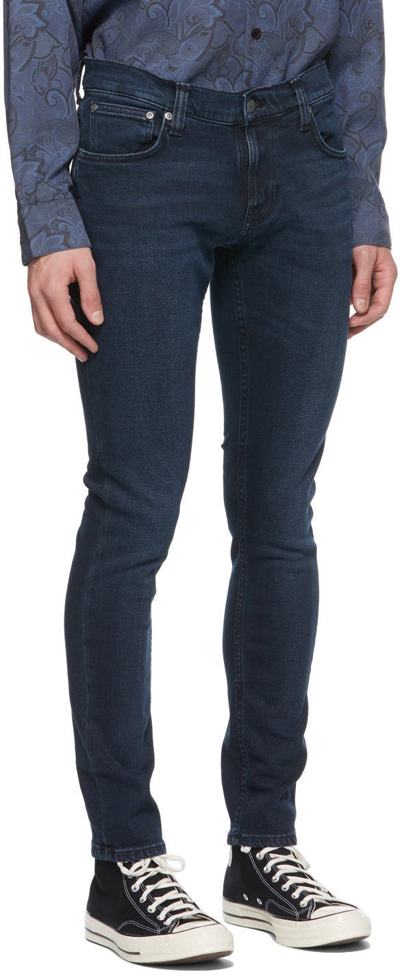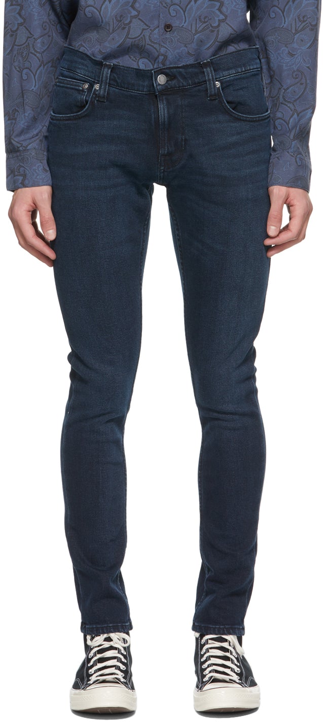 Slim-fit stretch 15 oz. organic cotton denim jeans in indigo. Mid-rise. Fading throughout. Five-pocket styling. Belt loops at waistband. Jacron logo patch in tan at back waistband. Textile logo patch and signature topstitching in black at back pockets. Zip-fly. Gunmetal-tone hardware. Supplier color: Blue revelation 99% organic cotton, 1% elastane. Brand: Nudie Jeans