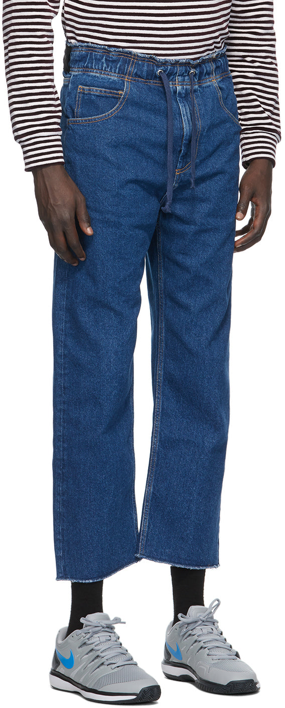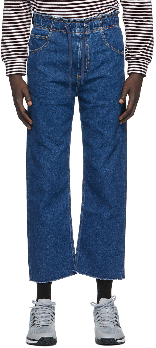Straight leg non-stretch denim jeans in blue. Mid-rise. Five-pocket styling. Elasticized waistband with drawstring fastening. Raw edge at cuffs. Textile logo patch at back waistband in black. Zip-fly. Logo-engraved silver-tone hardware. Contrast stitching in tan. Supplier color: Blue 100% cotton. Brand: Opening Ceremony
