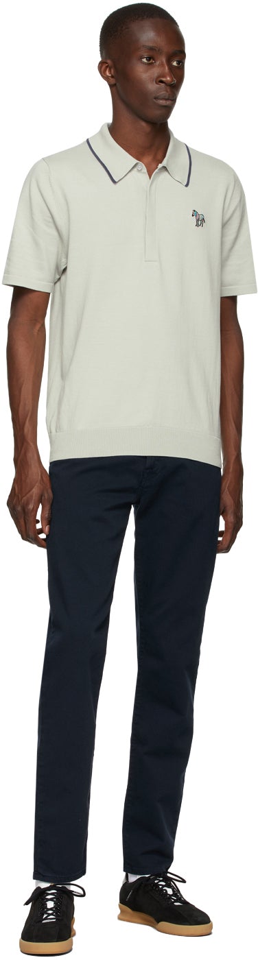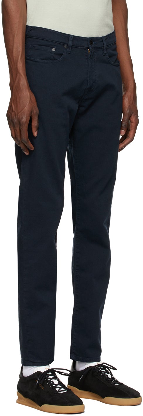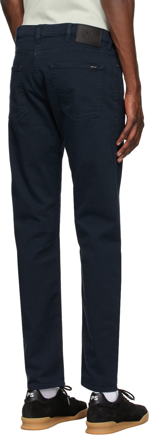 Tapered stretch organic cotton denim jeans in navy. Five-pocket styling. Belt loops at waistband. Buffed leather logo patch at back waistband. Zip-fly. Gold-tone hardware. Supplier color: Dark navy 98% organic cotton, 2% elastane. Brand: PS by Paul Smith