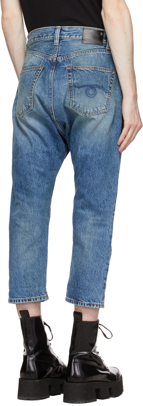 Straight-leg non-stretch denim jeans in blue. Low-rise. Dropped inseam. Fading, distressing, and whiskering throughout. Five-pocket styling. Belt loops at waistband. Leather logo patch at back waistband. Button-fly. Antiqued copper-tone hardware. Yellow contrast stitching. Supplier color: Jasper 100% cotton. Brand: 13