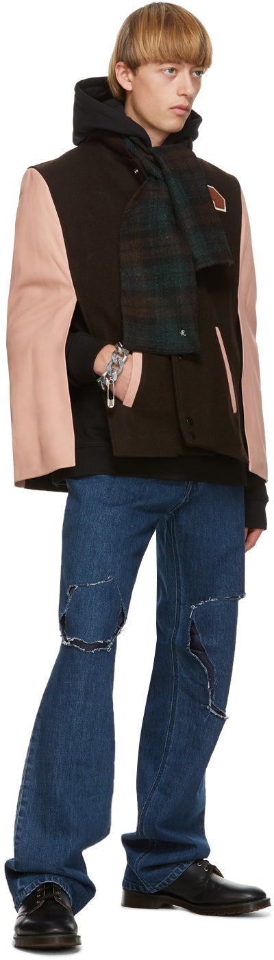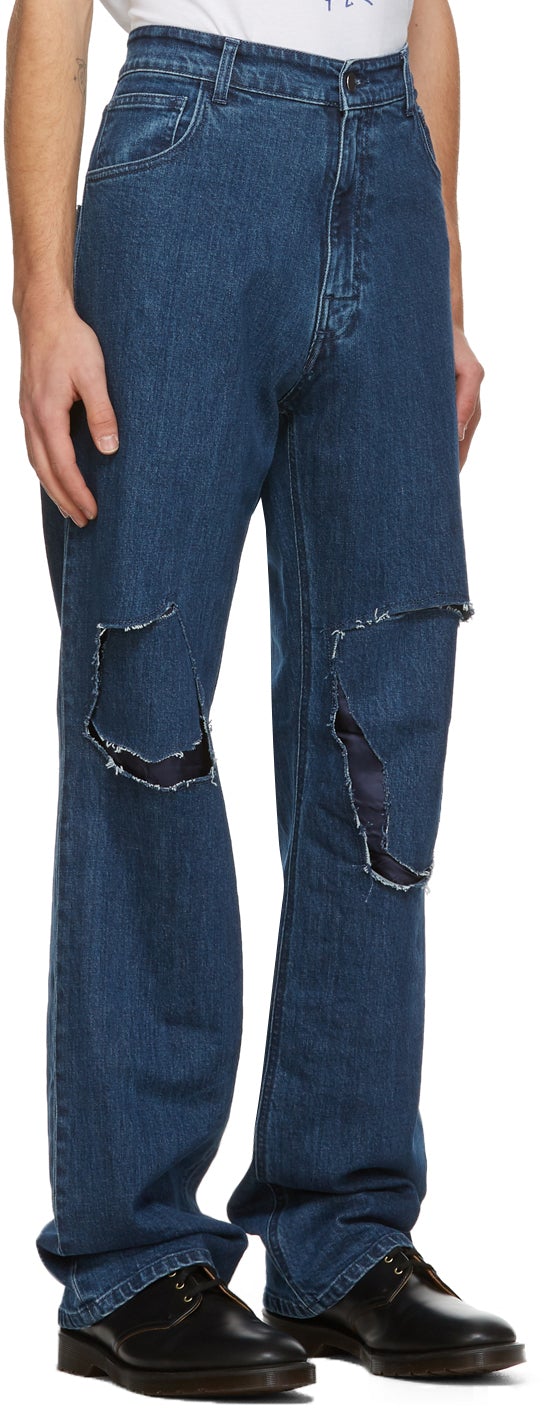 Relaxed-fit layered non-stretch denim jeans in navy. Tonal viscose-blend underlay at legs. Mid-rise. Six-pocket styling. Belt loops and rubberized logo patch at waistband. Raw edge and cut-out detailing at knees. Fully lined. Zip-fly. Silver-tone hardware. Supplier color: Navy Body 1: 100% cotton. Body 2: 50% acrylic, 50% viscose. Lining: 65% polyester, 35% cotton. Brand: Raf Simons