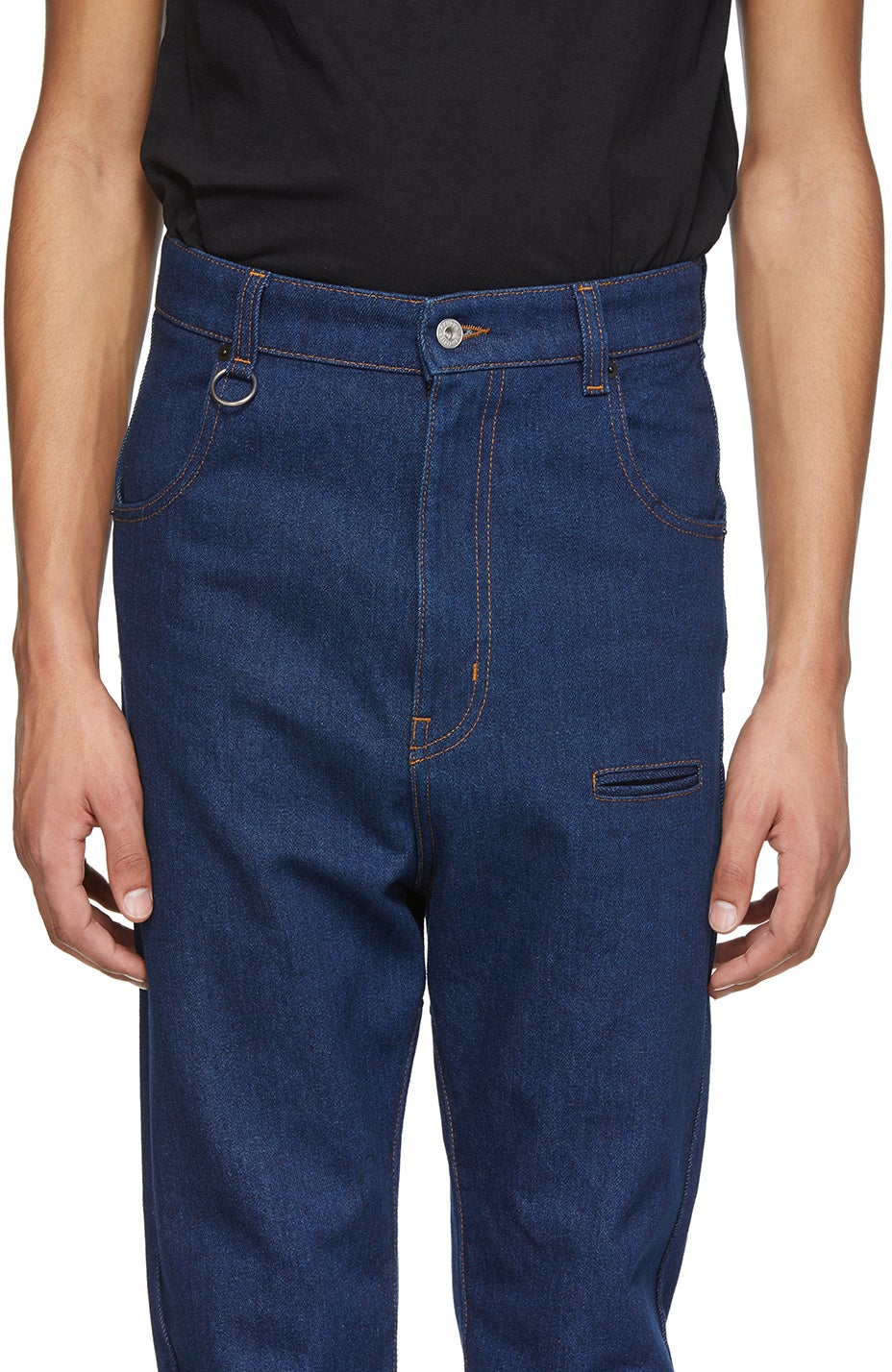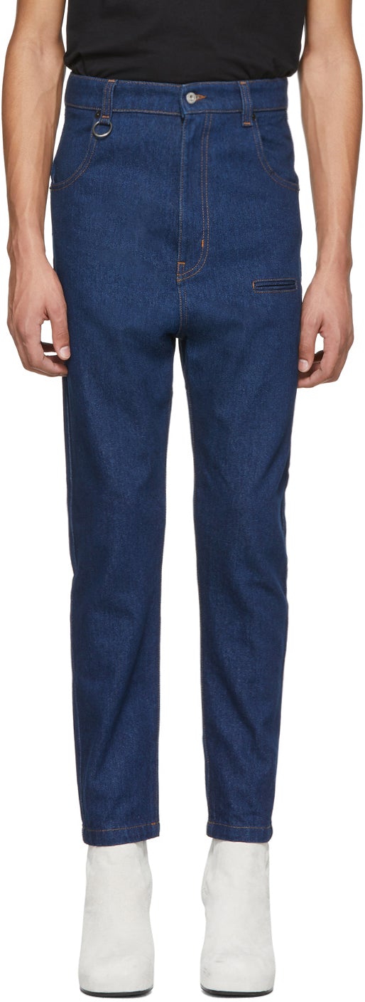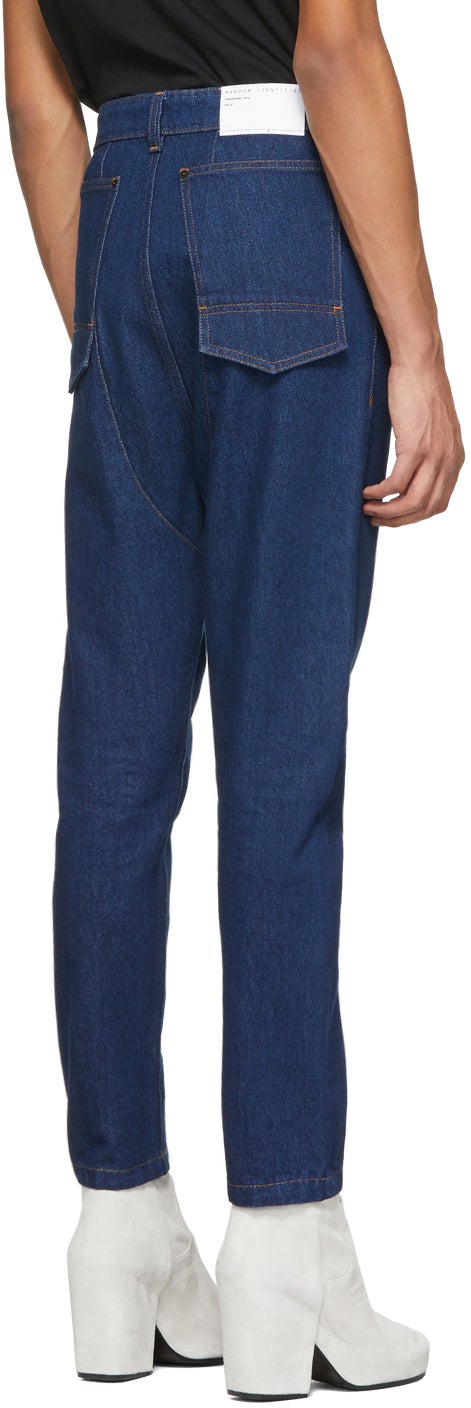 Tapered non-stretch denim jeans in blue. Mid-rise. Belt loops and keyring at waistband. Welt pocket at front. Logo patch in white at back waistband. Flap at back. Zip-fly. Contrast stitching in yellow. Silver-tone hardware. Supplier color: Blue Rinsed 100% cotton. Brand: Random Identities