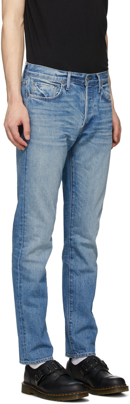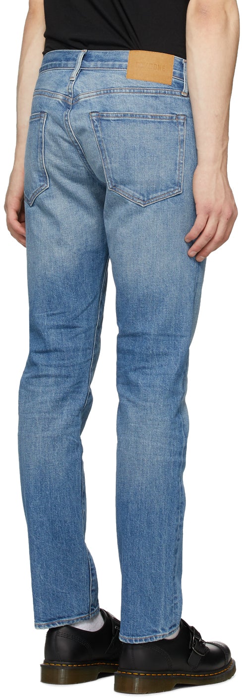 Slim-fit stretch Japanese denim jeans in blue. Mid-rise. Five-pocket styling. Distressing, fading, and whiskering throughout. Belt loops at waistband. Leather logo patch in tan at back waistband. Button-fly. Logo-engraved antiqued copper-tone and silver-tone hardware. Contrast stitching in tan. Supplier color: Light 51 98% cotton, 2% polyurethane. Brand: Re/Done