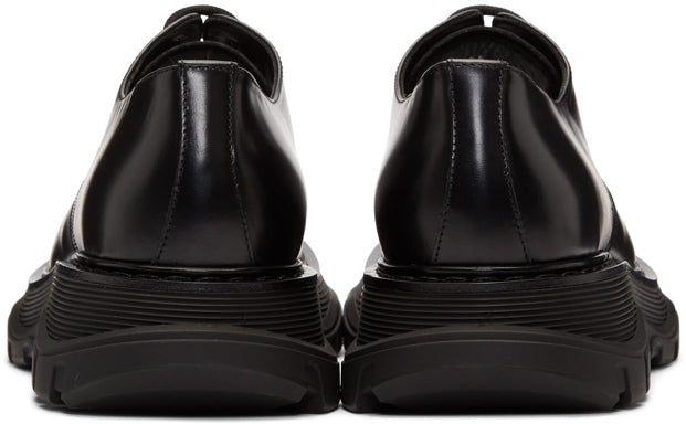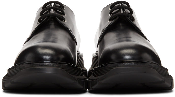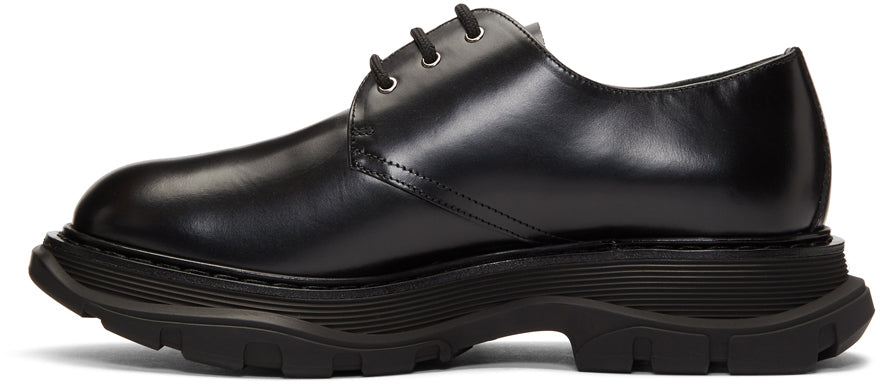 Buffed leather derbys in black. Round toe. Tonal lace-up closure. Tonal sculpted foam rubber midsole. Tonal treaded rubber sole. Silver-tone hardware. Supplier color: Black Upper: leather. Sole: rubber. Brand: Alexander McQueen