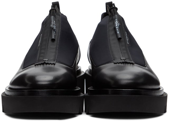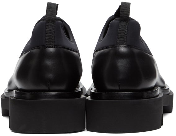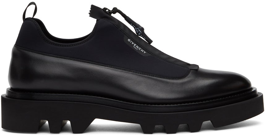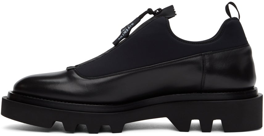 Low-top panelled neoprene and buffed calfskin derbys in black. Almond toe. Tonal zip closure. Logo printed in white at outer side. Tonal webbing pull-loop at heel collar. Stacked leather midsole. Tonal treaded rubber outsole. Tonal hardware. Supplier color: Black Upper: textile, calfskin. Sole: rubber. Brand: Givenchy
