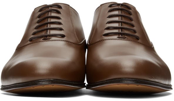 Buffed leather oxfords in brown. Almond toe. Tonal lace-up closure. Logo hardware at heel. Tonal stacked leather heel. Leather outsole in beige. Silver-tone hardware. Approx. 1 heel. Supplier color: Ebony Leather. Brand: Gucci