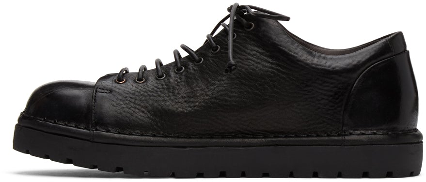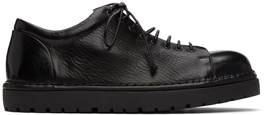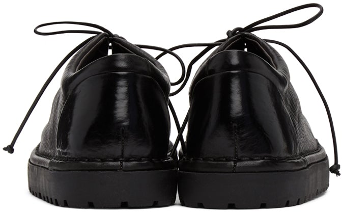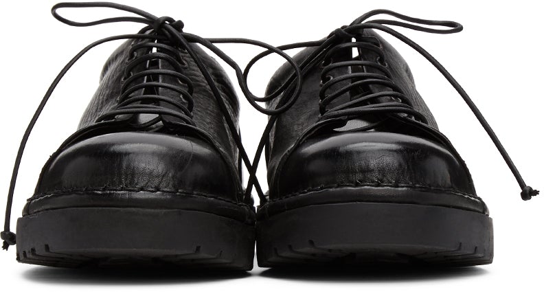 Polished grained volonato leather derbys in black. Round toe. Tonal lace-up closure. Padded tongue and collar. Tonal leather lining. Tonal rubber sole. Tonal hardware. Supplier color: Black Upper: leather. Sole: rubber. Brand: Marsèll
