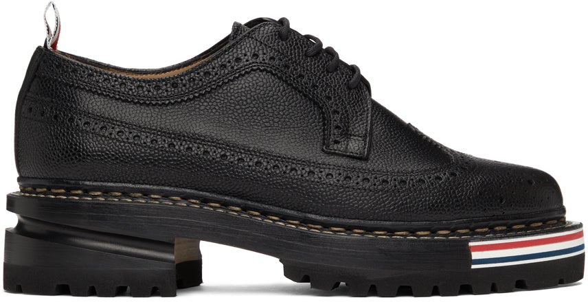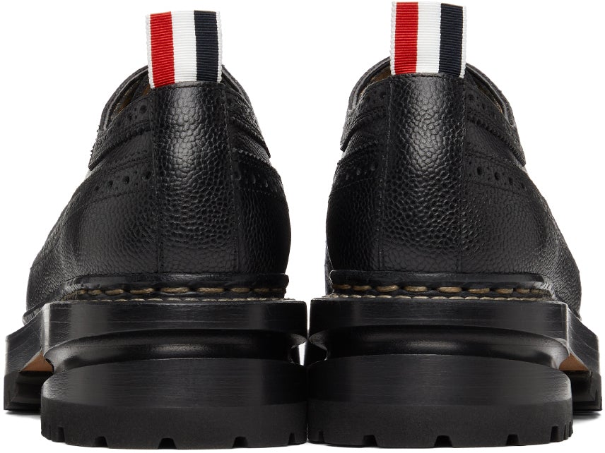 Pebble grained calfskin brogues in black. Perforated and serrated detailing throughout. Signature tricolor grosgrain trim at almond toe. Tonal lace-up closure. Signature tricolor grosgrain pull-loop at heel collar. Leather lining in beige. Tonal stacked leather midsole. Tonal treaded rubber sole. Supplier color: Black Upper: calfskin. Sole: rubber. Brand: Thom Browne
