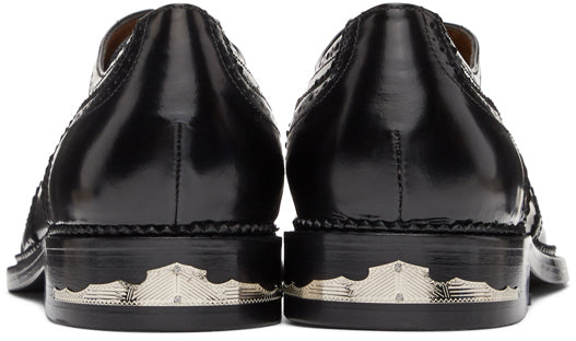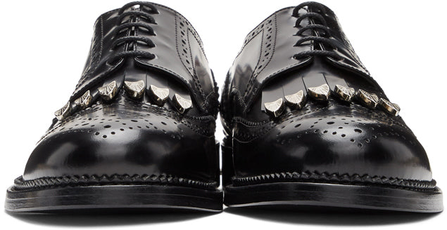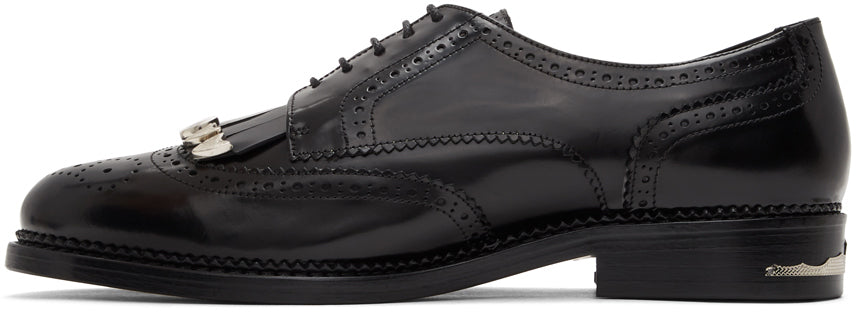 Polished leather brogues in black. Perforated and serrated detailing throughout. Round toe. Leather fringe with hardware detailing at vamp. Tonal lace-up closure. Leather lining in tan. Tonal stacked leather sole featuring hardware detailing. Engraved silver-tone hardware. Approx. 1 heel. Supplier color: Black Leather. Brand: Toga Virilis