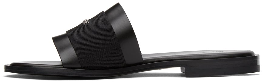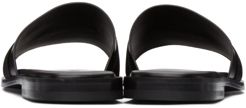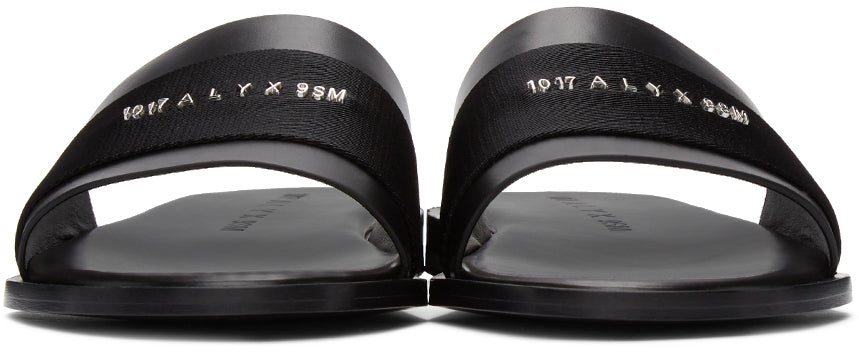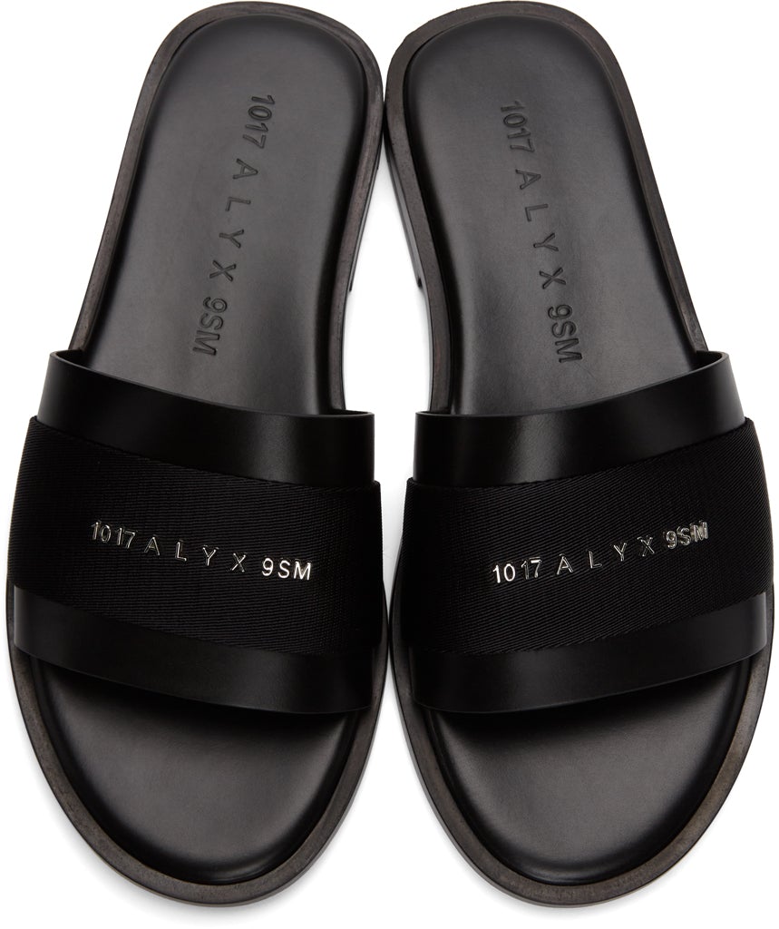 Buffed leather slip-on sandals in black. Open round toe. Strap with tonal webbing trim and logo plaque at vamp. Logo embossed at padded leather footbed. Tonal stacked leather heel. Tonal leather sole. Silver-tone hardware. Supplier color: Black Leather. Brand: 1017 ALYX 9SM