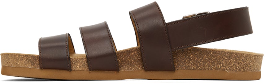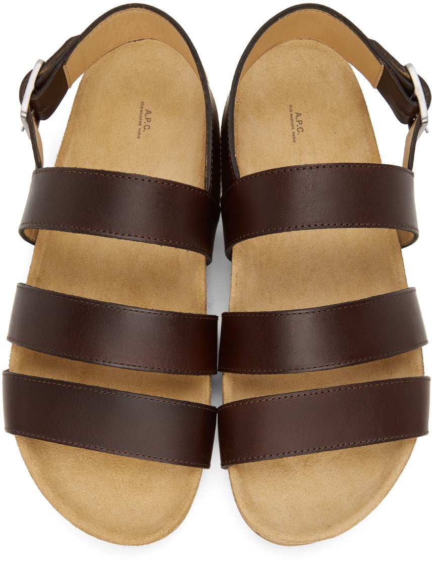 Buffed leather sandals in brown. Open round toe. Adjustable ankle strap with pin-buckle fastening. Embossed logo at beige suede footbed. Cork midsole in tan. Tonal treaded rubber outsole. Silver-tone hardware. Supplier color: Dark brown Upper: leather. Sole: rubber. Brand: A.P.C.