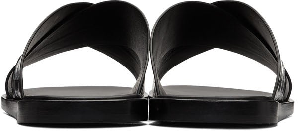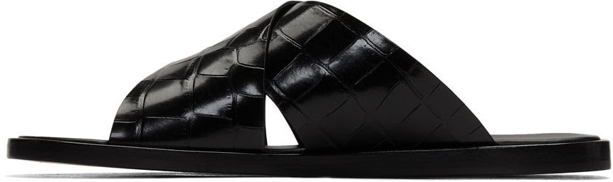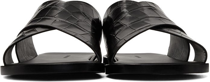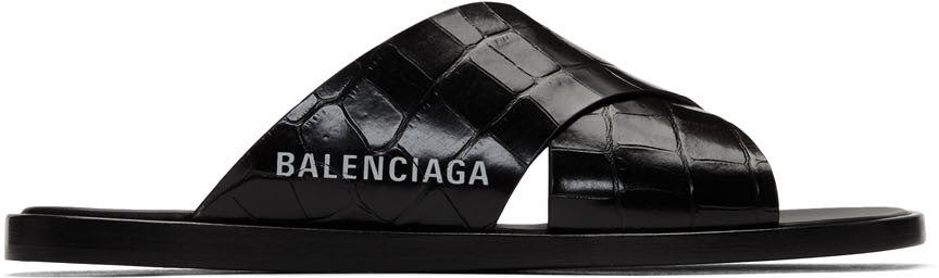 Polished croc-embossed leather sandals in black. Open round toe. Logo printed in white at outer side. Grained leather footbed. Tonal leather sole with rubber injection at heel. Supplier color: Black Leather. Brand: Balenciaga