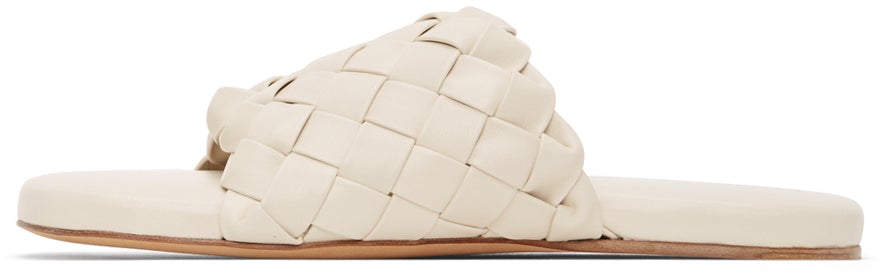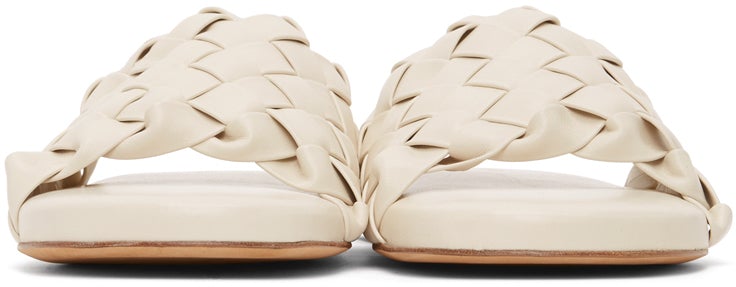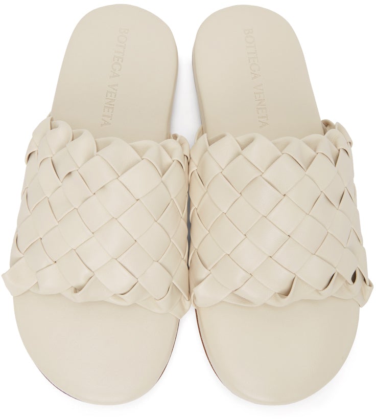 Intrecciato calfskin slip-on sandals in off-white. Open round toe. Embossed logo at tonal leather footbed. Leather sole in tan. Supplier color: Trench Upper: calfskin. Sole: leather. Brand: Bottega Veneta