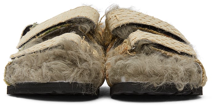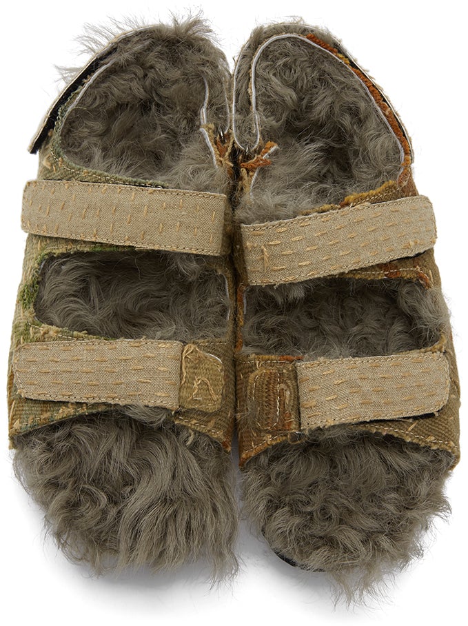Pair of mismatched distressed recycled canvas sandals in tones of beige, green, tan, and orange. Embroidery in beige throughout. Open round toe. Adjustable Velcro straps at vamp and ankle. Shearling lining in grey. Treaded foam rubber sole in black. Gunmetal-tone hardware. Each item is unique. Please note that coloration, graphics, and finishings may vary. Supplier color: Light Upper: recycled textile, lambskin. Sole: rubber. Brand: By Walid