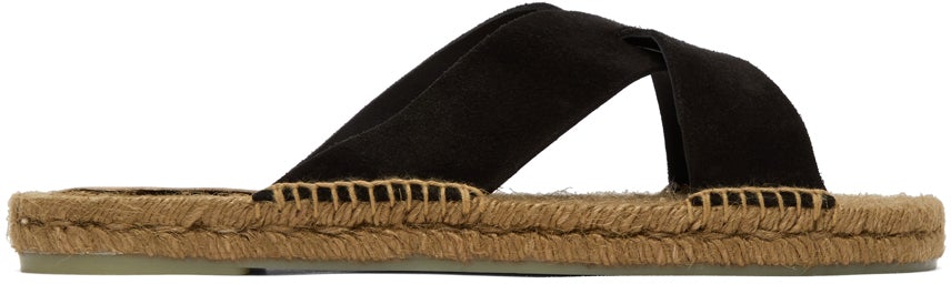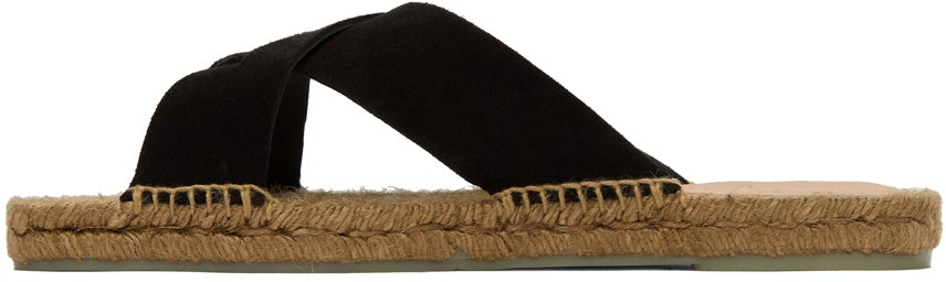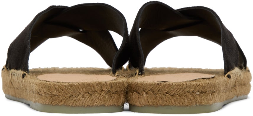 Suede and jute sandals in black and beige. Open square toe. Criss-crossing straps at vamp. Logo-embossed buffed leather trim in tan at braided jute footbed. Blanket stitching at welt. Braided jute midsole. Tonal treaded rubber outsole. Supplier color: Black Upper: leather. Sole: rubber. Brand: Castañer