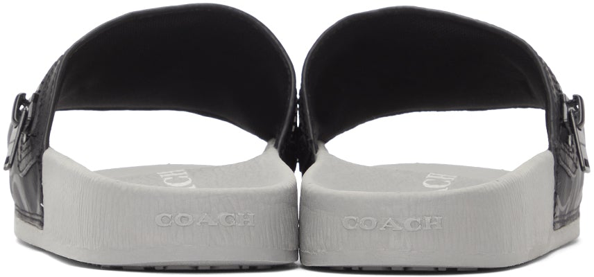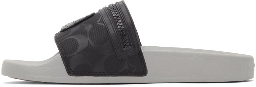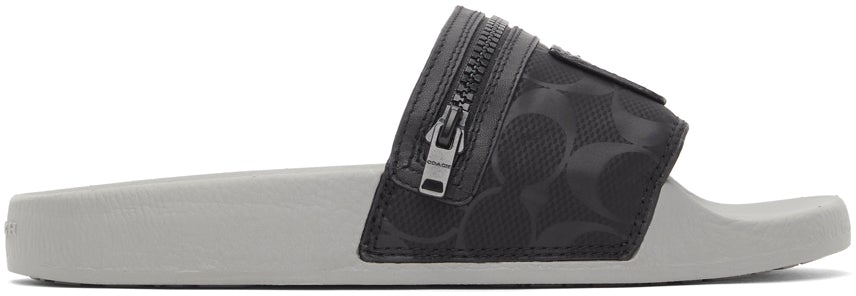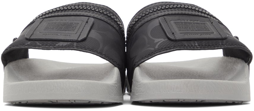 Coated nylon jersey sandals in black featuring tonal logo pattern. Zippered compartment and textile logo patch at strap. White logo printed at grey molded rubber footbed. Treaded rubber sole in grey. Tonal hardware. Supplier color: Black washed steel Upper: nylon. Sole: rubber. Brand: Coach 1941