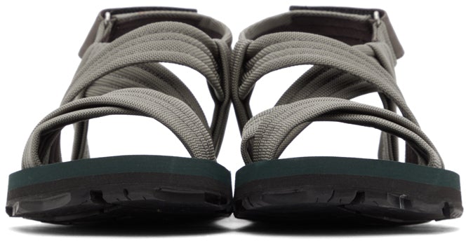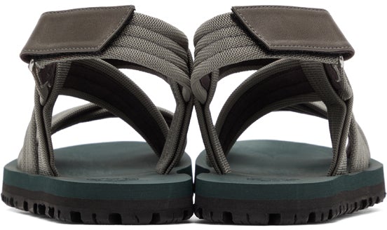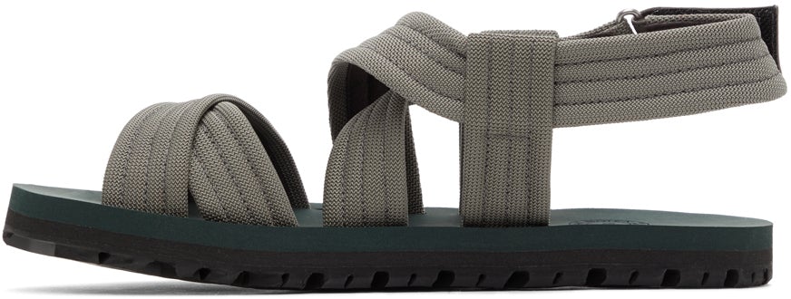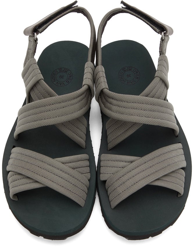 Canvas sandals in grey. Open round toe. Criss-crossing straps at vamp. Adjustable Velcro strap at ankle. Logo embossed at rubber footbed. Treaded rubber outsole in black. Silver-tone hardware. Supplier color: Grey Upper: textile. Sole: rubber. Brand: Dries Van Noten