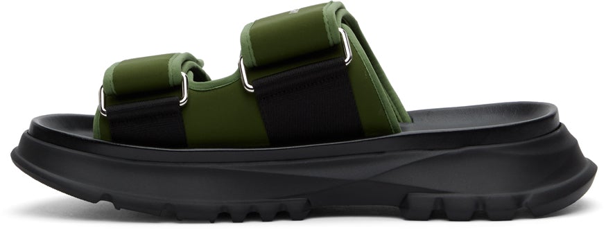 Neoprene sandals in khaki. Open round toe. Adjustable Velcro straps with logo printed in white at vamp. Logo printed in white at molded rubber footbed. Treaded rubber sole in black with logo embossed at side. Silver-tone hardware. Supplier color: Khaki Upper: textile. Sole: rubber. Brand: Givenchy