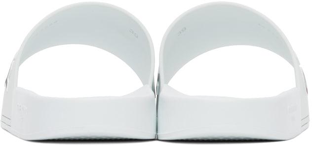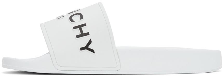 Rubber slip-on sandals in white. Open round toe. Logo embossed in black at vamp. Molded rubber footbed. Tonal textured rubber midsole featuring embossed logo at outer side. Tonal treaded rubber sole. Supplier color: White Rubber. Brand: Givenchy