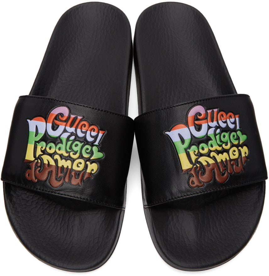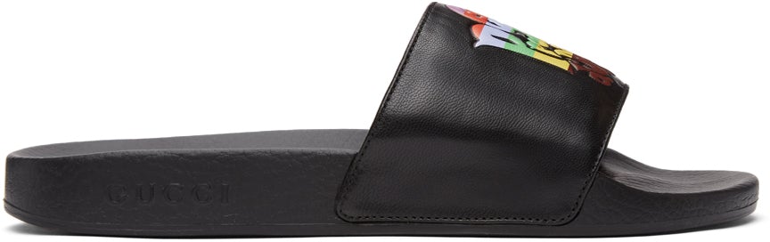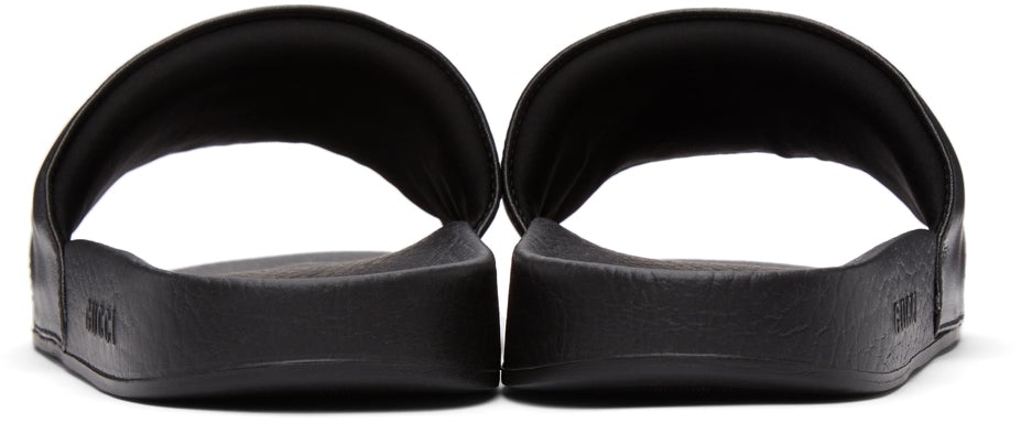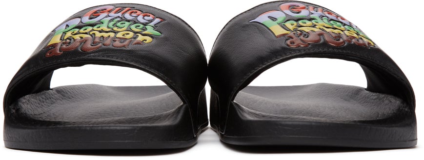 Buffed leather slip-on sandals in black. Logo embossed in multicolor at strap. Tonal molded rubber footbed. Tonal treaded rubber outsole. Supplier color: Black Upper: leather. Sole: rubber. Brand: Gucci