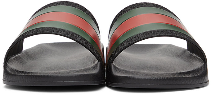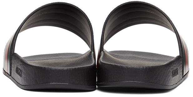 Rubber slip-on sandals in black. Open round toe. Signature stripes in red and green at vamp. Molded rubber footbed. Tonal textured rubber midsole featuring embossed logo at outer sides. Tonal treaded rubber outsole. Supplier color: Black Rubber. Brand: Gucci