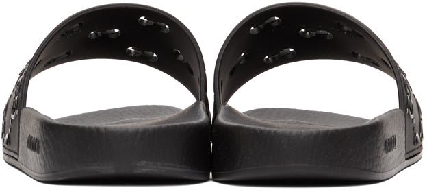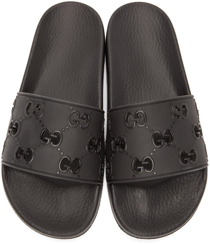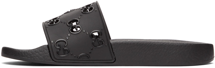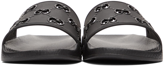 Rubber slip-on sandals in black. Open round toe. Cut-out logo pattern at vamp. Logo embossed at outer side. Tonal molded rubber footbed. Tonal rubber sole. Supplier color: Black Rubber. Brand: Gucci