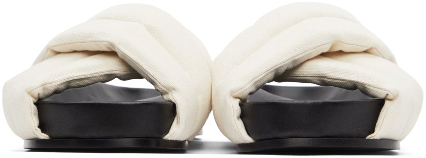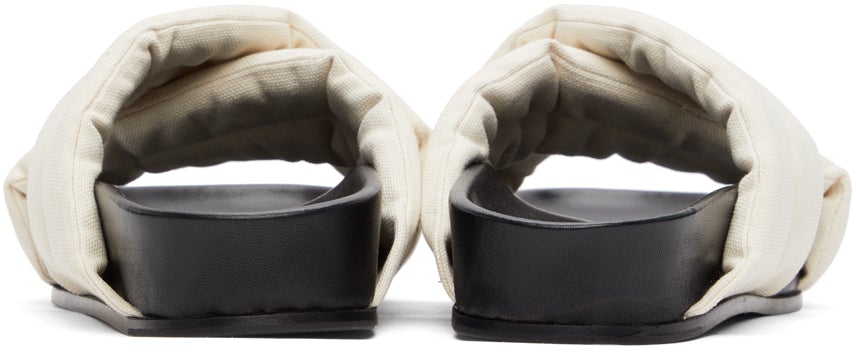 Padded canvas slip-on sandals in beige. Criss-crossing straps at vamp. Textile logo patch at black molded leather footbed. Leather sole in black. Supplier color: Light beige Upper: textile. Sole: leather. Brand: Jil Sander
