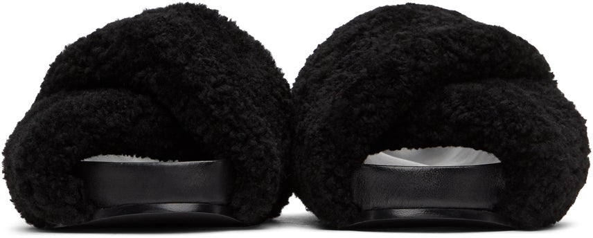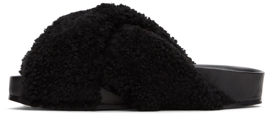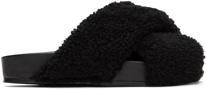 Sherpa leather slip-on sandals in black. Open round toe. Padded criss-crossing leather straps at vamp. Logo printed at molded leather footbed. Tonal leather sole. Supplier color: Black Upper: textile. Sole: leather. Brand: Jil Sander