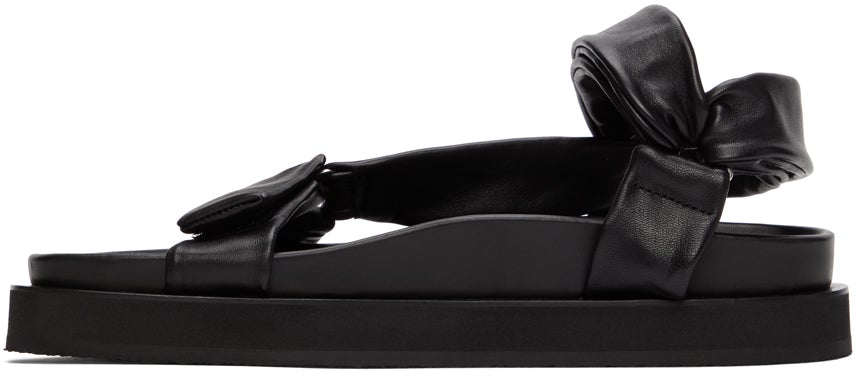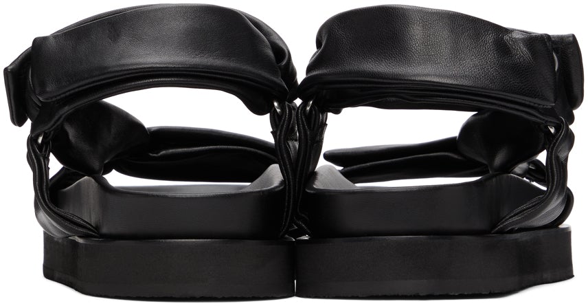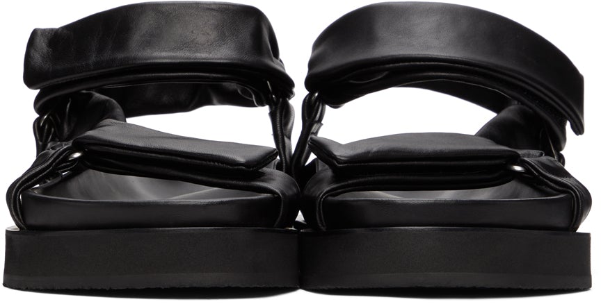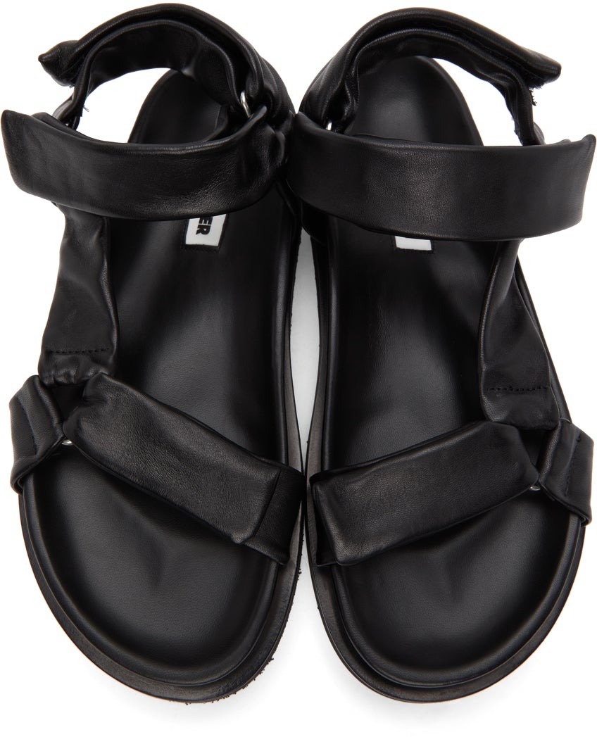 Grained nappa sheepskin sandals in black. Open round toe. Adjustable Velcro straps at vamp and ankle. Textile logo patch at tonal molded leather footbed. Tonal treaded rubber sole. Silver-tone hardware. Supplier color: Black Upper: sheepskin. Sole: rubber. Brand: Jil Sander