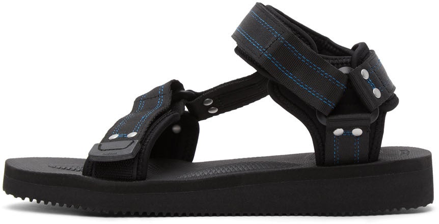 Nylon sandals in black. Open round toe. Logo patch, adjustable Velcro straps, and logo flag at vamp. Tonal bonded jersey detailing at heel collar. Logo embossed at tonal EVA antibacterial molded foam rubber footbed. Tonal treaded foam rubber sole. Silver-tone hardware. Contrast stitching in blue. Part of the John Elliott x Suicoke collaboration. Supplier color: Black Upper: textile. Sole: rubber. Brand: John Elliott