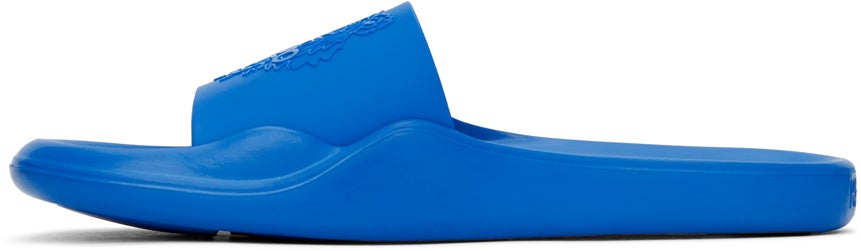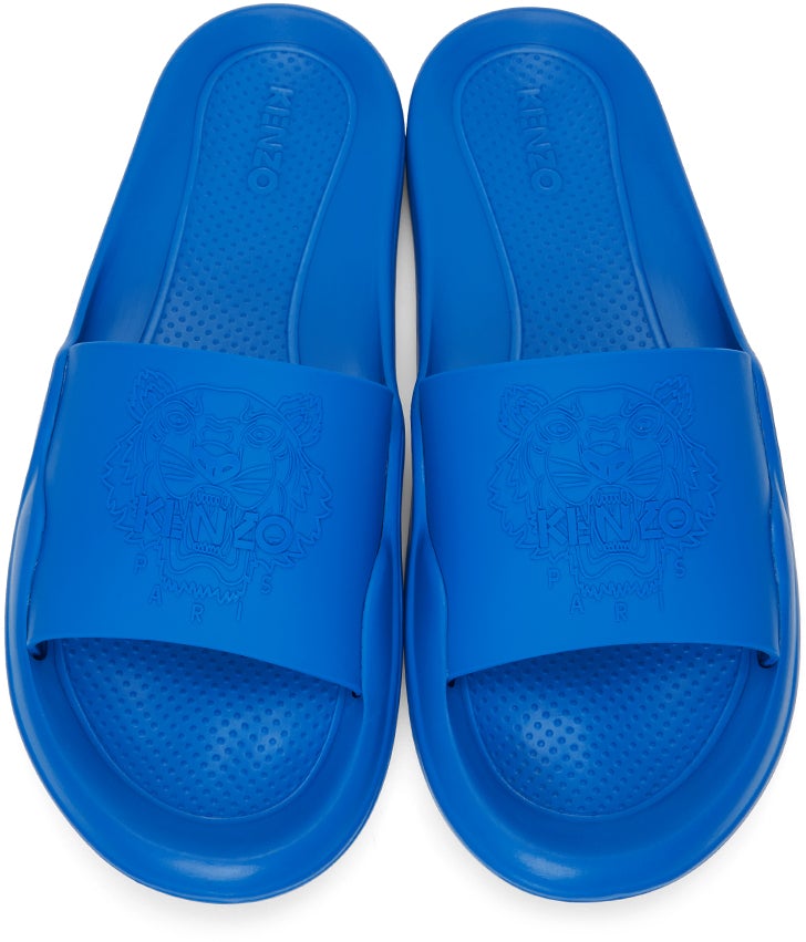 Rubber slip-on sandals in blue. Open round toe. Logo graphic-embossed strap at vamp. Logo embossed at molded rubber footbed and heel. Tonal treaded rubber sole. Supplier color: Cyan Rubber. Brand: Kenzo