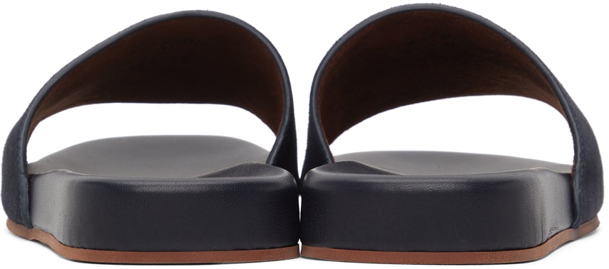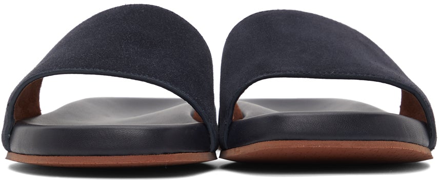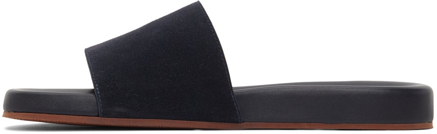Calfskin suede slip-on sandals in navy. Open round toe. Logo embossed at padded nappa leather footbed. Treaded rubber outsole in brown. Supplier color: Blue navy Upper: calfskin. Sole: rubber. Brand: Loro Piana