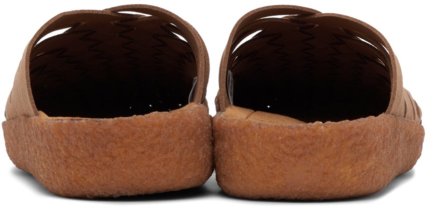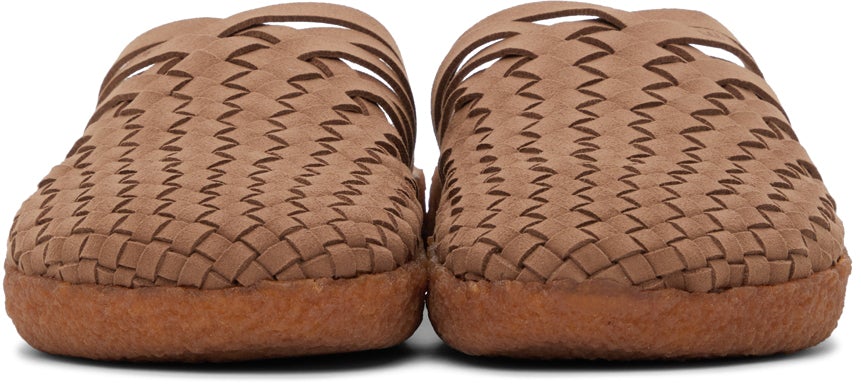 Handcrafted woven faux-suede slip-on sandals in brown. Round toe. Logo embossed at vamp. Logo embossed at tonal molded faux-suede footbed. Crepe rubber sole in tan. Supplier color: Walnut/Tan Upper: synthetic. Sole: rubber. Brand: Malibu Sandals