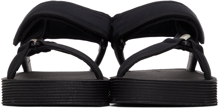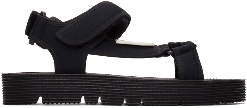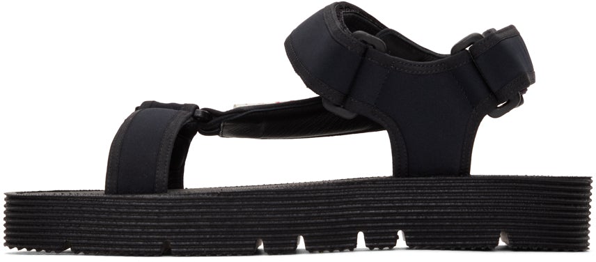 Textile sandals in black. Open round toe. Padded strap and textile logo patch in white and red at vamp. Adjustable padded Velcro straps at ankle. Logo embossed at tonal foam rubber footbed. Tonal buffed leather insole. Tonal treaded foam rubber sole. Tonal hardware. Supplier color: Black Upper: textile. Sole: leather, rubber. Brand: Marni